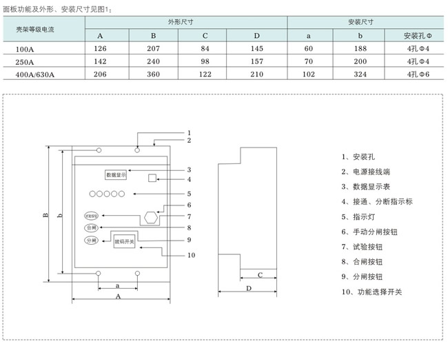 ·额定电压:380V220V三相四线 ·额定频率:50Hz ·额定电流:63A、100A、160A、200A、250A、400A、630A ·额定辅助电源电压:220V(进线端左面1接N,进线端右面1接A相) ·剩余动作电流:1000mA ·额定漏电动作电流:100mA、300mA、500mA、1000mA ·额定漏电动作电流:50mA、150mA、250mA、500mA ·突变电流:50mA、75mA ·缓变电流:300mA ·自动跟踪定档:200mA、400mA、600mA、800mA、1000mA ·额定分断时间:0.2S、0.3S、0.5S、1.0S(出厂设定在0.3S) ·延时重合闸:20S~60S ·欠压动作值单相155V±5%(电压恢复正常后能自动重合闸) ·过压操动作值单相280V±5%(电压恢复正常后能自动重合闸) ·显示漏电自动跟踪定档值 ·具有自动记忆功能 ·漏电动作值特陛分类: AC型 ·额定极限短路分断能力见 表1 ·过电流脱扣器保护特性见 表2 ·本产品符合:GB1 4048.2-2008