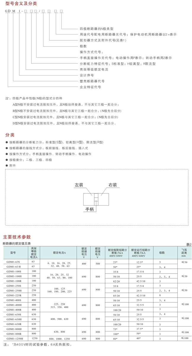 概述 GDM1系列塑料外壳式断路器(以下简称断路器)是本公司综合采用国际先进技术,开发的新型断路器之一。其额定绝缘电压800V,适用于交流50Hz或60Hz,额定工作电压至690V,额定工作电流从6A至1250A的配电网络电路中,用来分配电能和保护线路及电源设备免受过载、短路、欠电压等故障的损坏。同时也能作为电动机的不频繁起动及过载、短路、欠电压保护。 断路器按其额定极限短路分断能力的高低,分为L型(标准型),H型(较高型),R型(限流型)三类。 该断路器具有体积小、分断高、飞弧短(或无飞弧)等特点,是用户使用的理想产品。 断路器垂直安装(即竖装)亦可水平安装(横装)。 断路器符合IEC60947-2、G.B14048.2标准。
